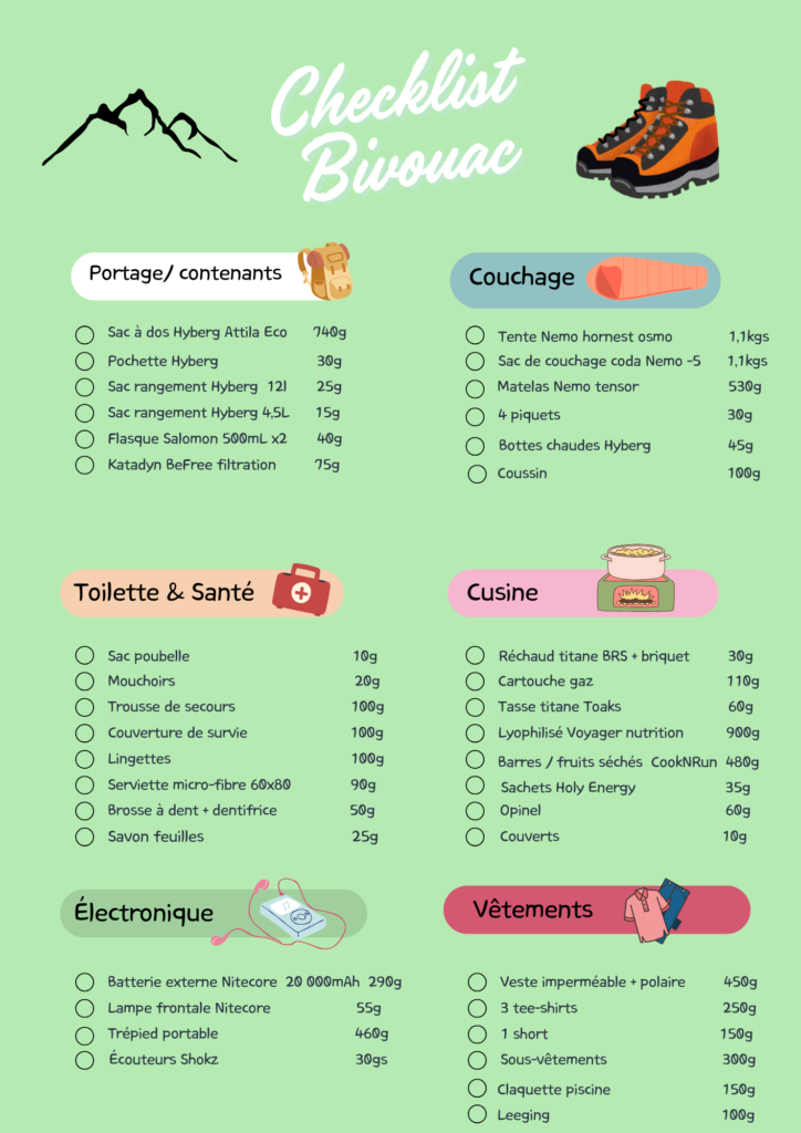 Tu trouveras ci-dessous ma liste lorsque je pars 3-4 jours en Trek. Mon sac pèse environ 8kgs eau non comprise.